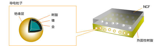 本材料拥有优异的传导特性和端子间绝缘特性,特别适合进行细间距(Fine pitch)连接,可将驱动IC,直接邦定在平板显示面板的玻璃基板上。