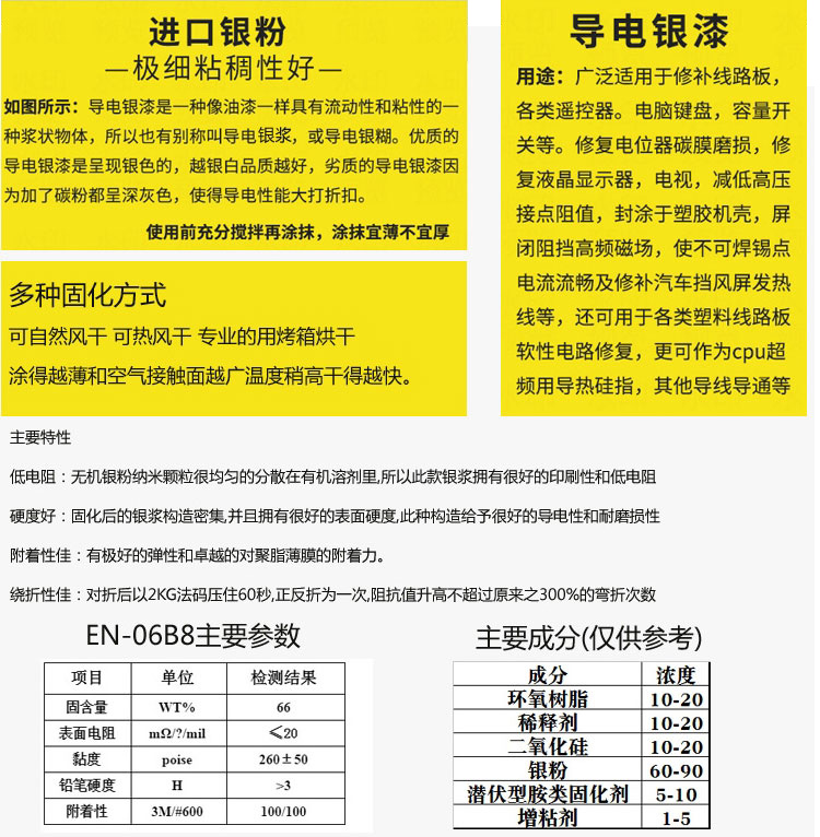 导电银胶是一种固化后具有一定导电性能的胶黏剂,又叫导电银浆,导电银糊,导电漆,导电胶,它通常以基